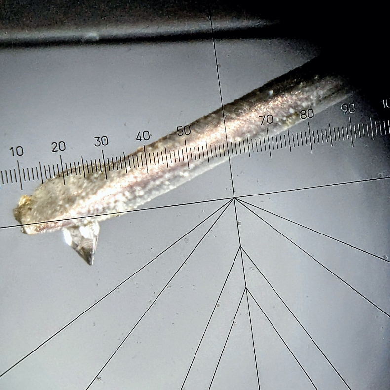 実際遠目に眺めて汚れで瘡蓋着いた状態の針先が丸まって見えたのか『擦り減った』と言う方が実に多いのですが、少なくとも私自身は今迄数千個の針先を眺めて来て、擦り減った針先を見た事は残念ながらないし、またビニールで一分間に33・1/3~45回転程度の速さでダイヤモンドを擦って削る方法も知りません。蓄音機の鉄針が純粋に擦り減った姿とか、それこそクリーナーの使い過ぎでチップが脱落した姿や、ダイヤ故の“欠け”は極まれに見た事がありましたが…